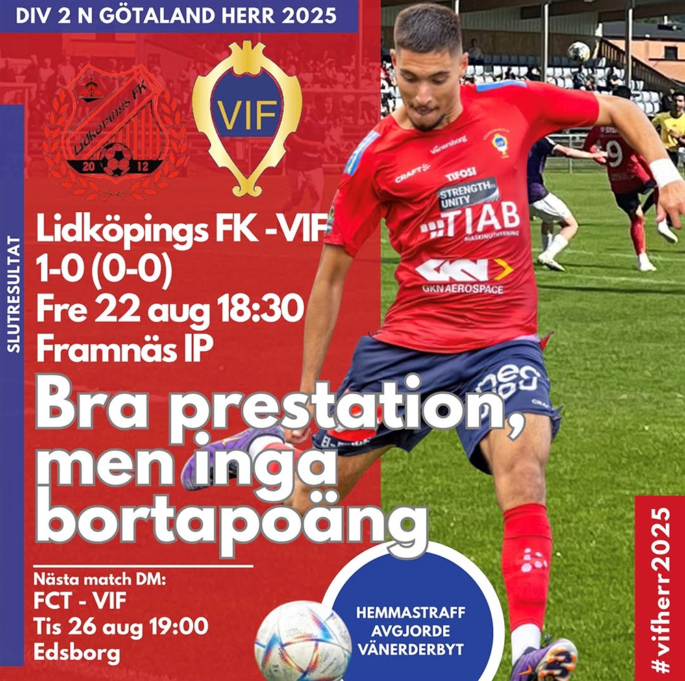 VIF:s herrar gjorde en mycket stark insats borta mot tabelltvåan Lidköpings FK, men trots flera jättelägen och bra tryck framåt efter paus blev det inga poäng med hem från Vänerderbyt.