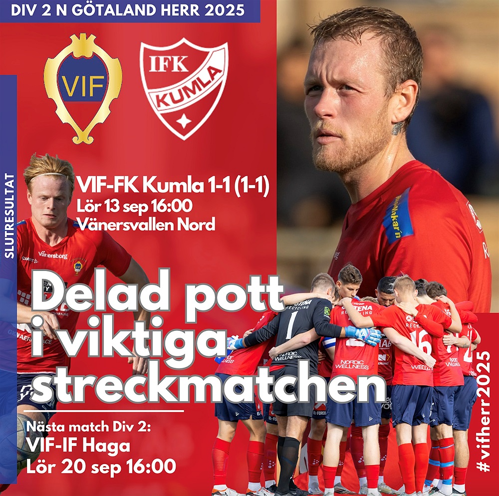 Precis som i bortamötet i Kumla i vårmötet slutade hemmamötet 1-1 (1-1) för VIF Herr när IFK Kumla gästade Vänersvallen Nord på lördagen. Det innebär att rödblått ligger kvar ovanför nedre kvalstrecket i Division 2, med just Kumla en poäng efter. Gästerna tog en tidig ledning efter att målvakten Jonathan Erlandsson tappat in en frispark.