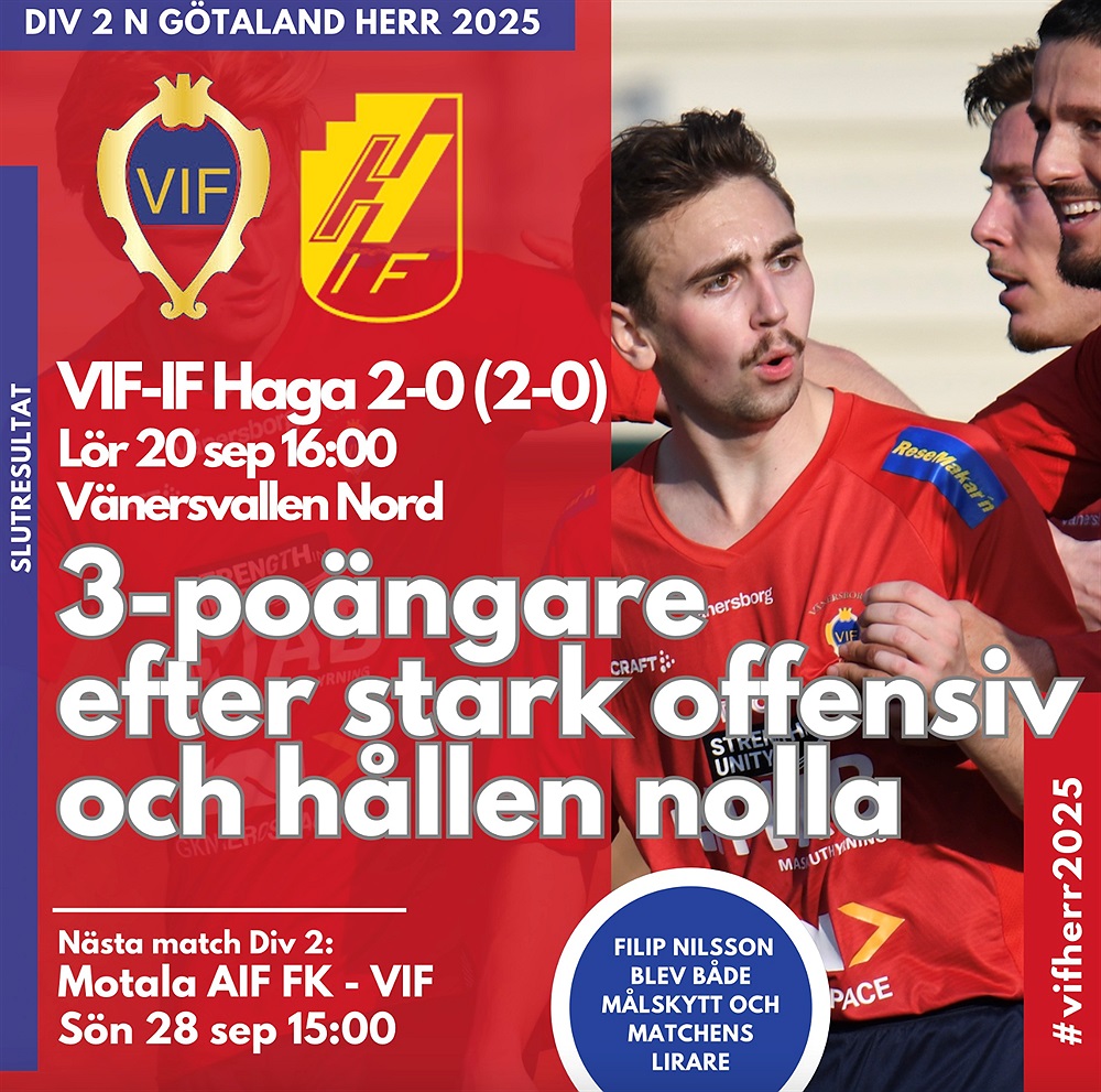 VIF:s herrar tog tag i taktpinnen direkt i den viktiga hemmamatchen mot IF Haga på lördagen i septembersolen på Vänersvallen Nord. Det gav en skön 3-poängare och den tredje raka matchen med poängutdelning: 5 poäng på de tre senaste matcherna mot IK Kongahälla (1-1), IFK Kumla (1-1) och IF Haga från Jönköping gör att VIF nu hoppade uppåt i tabellen och fick fyra poäng ned till det nedre kvalstrecket med fyra matcher kvar i Division 2-spelet.