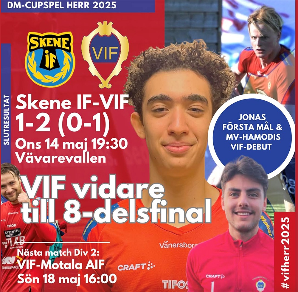 VIF:s herrar är vidare till Åttondelsfinal i DM-spelet efter att ha bortabesegrat Division 4-laget Skene IF med 1-2 (0-1) på onsdagskvällen.