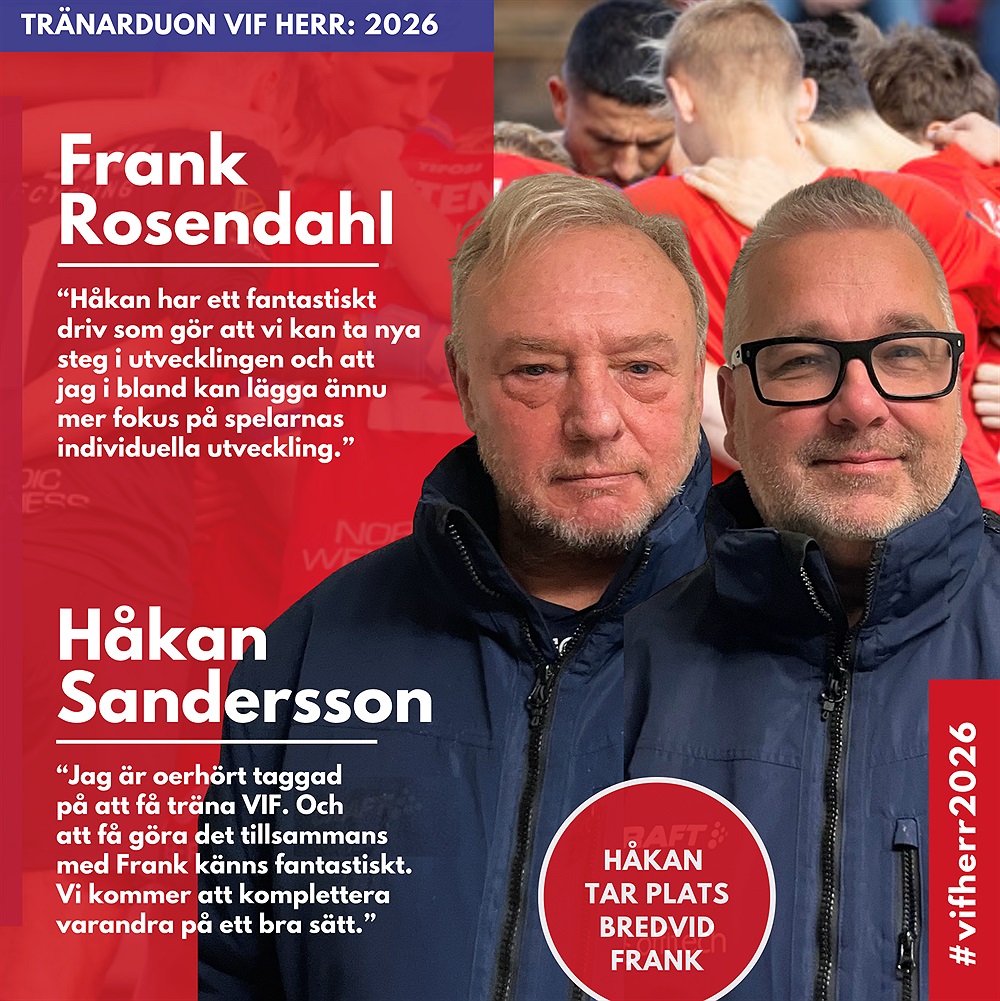 Det blir en mycket erfaren och hängiven duo som tar huvudansvaret för VIF:s Herrtrupp i Division 2 säsongen 2026. Frank Rosendahl får sällskap av Håkan Sandersson, som de senaste tre säsongerna lett Trollhättans FK.