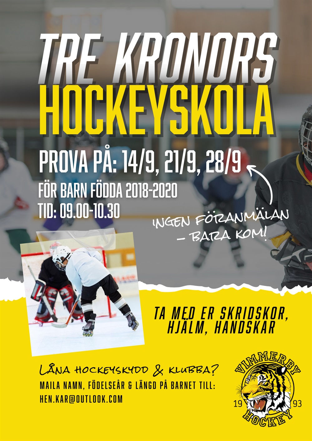 Tre Kronors Hockeyskola är ett rikstäckande koncept för att lära våra yngsta barn att spela hockey. Vimmerby Hockey är stolta medverkare i konceptet. Välkomna att komma med era barn till vår verksamhet. Säsongen 2025-2026 vänder sig TKH till alla barn som vill börja eller fortsätta med hockey och skridskor. Tiden är klockan 09:00-10:30 på söndagar (med start 14:e september 2025) där vi främst fokuserar på att åka skridskor, övningar med puck och matcher på små ytor. För den som vill fortsätta att lära sig mer kring skridskoåkning får göra det med ledare som visar.