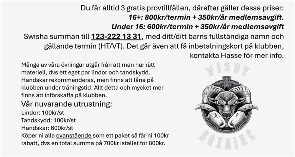 Visby Boxningsklubb är ett glatt gäng som strävar efter att skapa en plats på vår lilla ö där man alltid är välkommen, oavsett ålder, kön eller fysisk förmåga, för att träna och även öppna möjligheter för att tävla i boxning.
