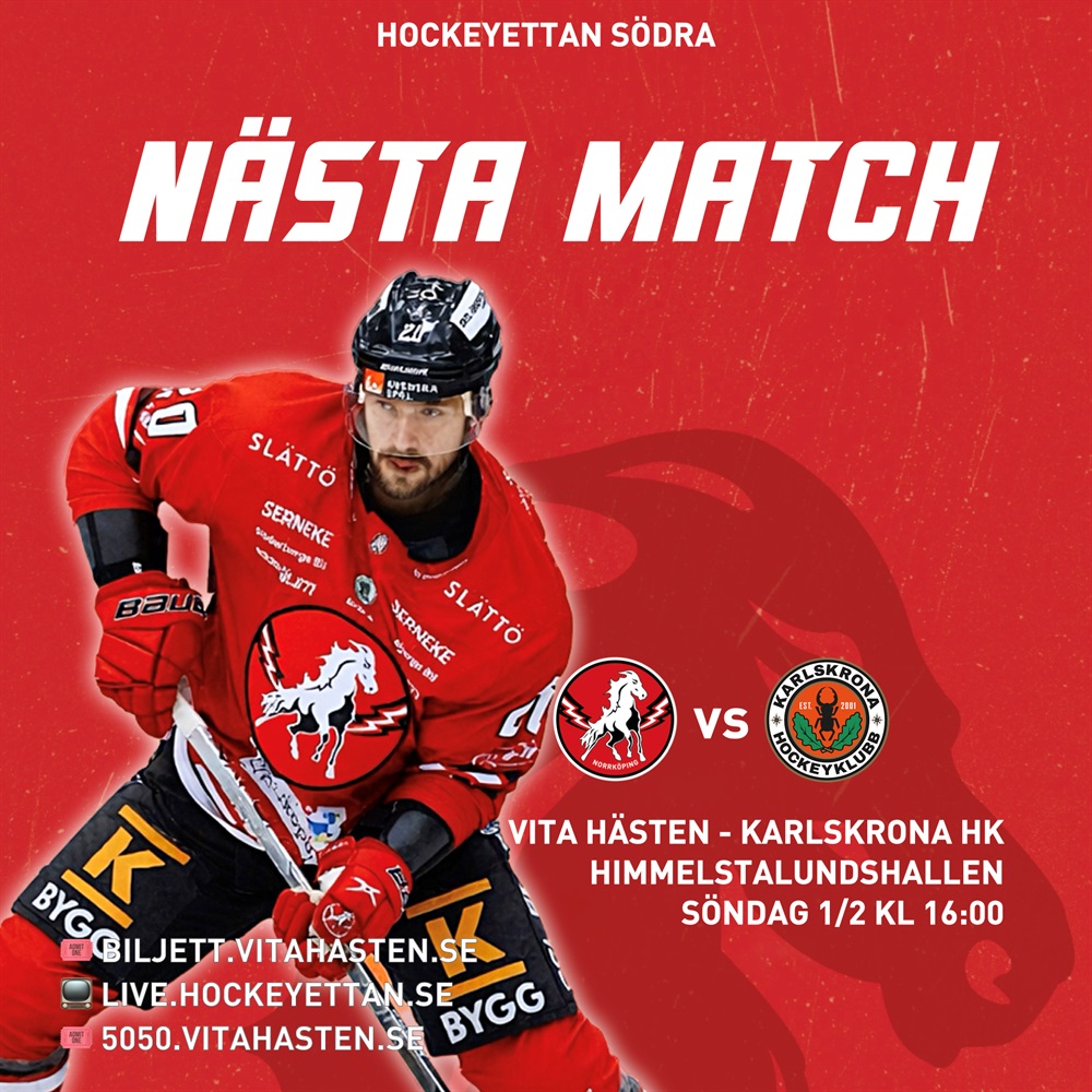 På söndag smäller det i Himmelstalundshallen – Marcus Eriksson gör comeback i Vita Hästen mot Karlskrona HK! Två formstarka topplag i Hockeyettan Södra drabbar samman i en match som kan få stor betydelse för tabellens toppstrid. Det blir intensitet, känslor och garanterat full fart från första nedsläpp – och det vill du inte missa!