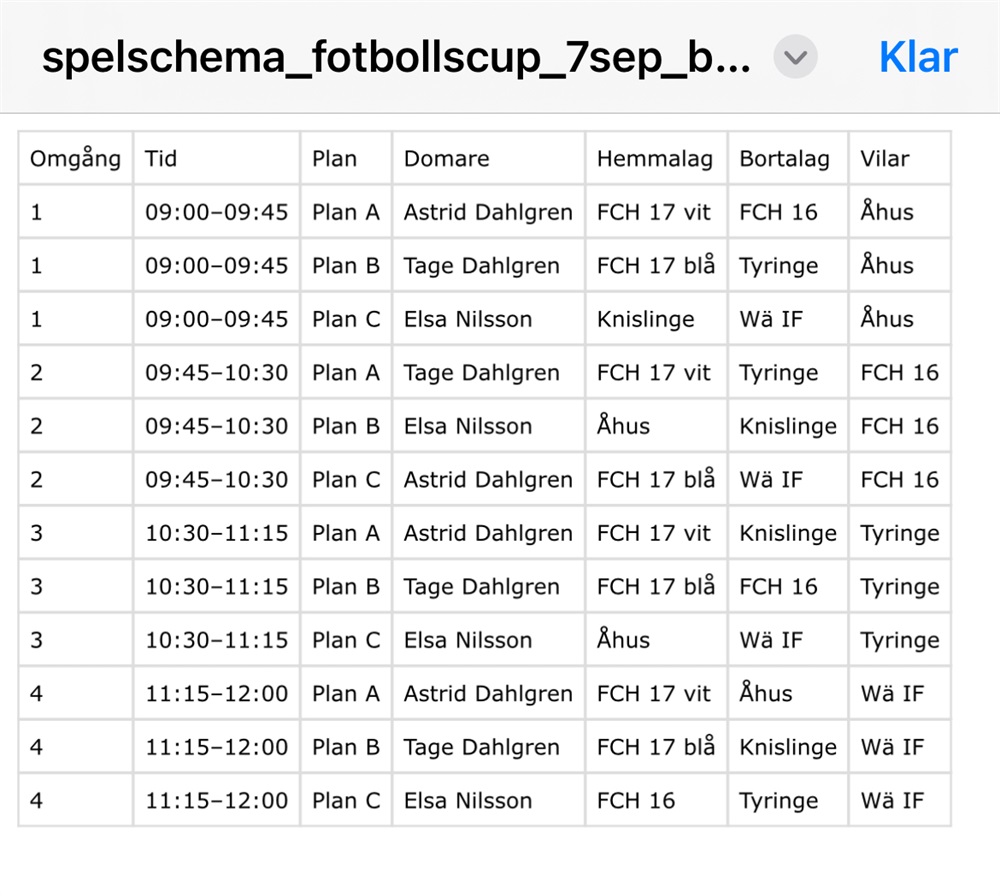 Vi har nu fått tider och spelschema som jag lägger in här.