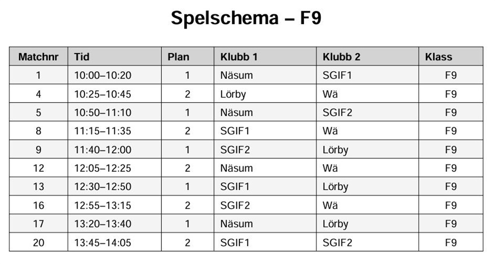 Vi samlas ombytta i Bromölla kl 9.40, första matchen startar kl. 10.25 och sista spelas 12.55. Spelformen är 5 mot 5, matcherna 20 minuter utan paus, och bara en kort stunds vila mellan matcherna. Det blir en kul och intensiv förmiddag att se fram emot (spelschema bifogat).