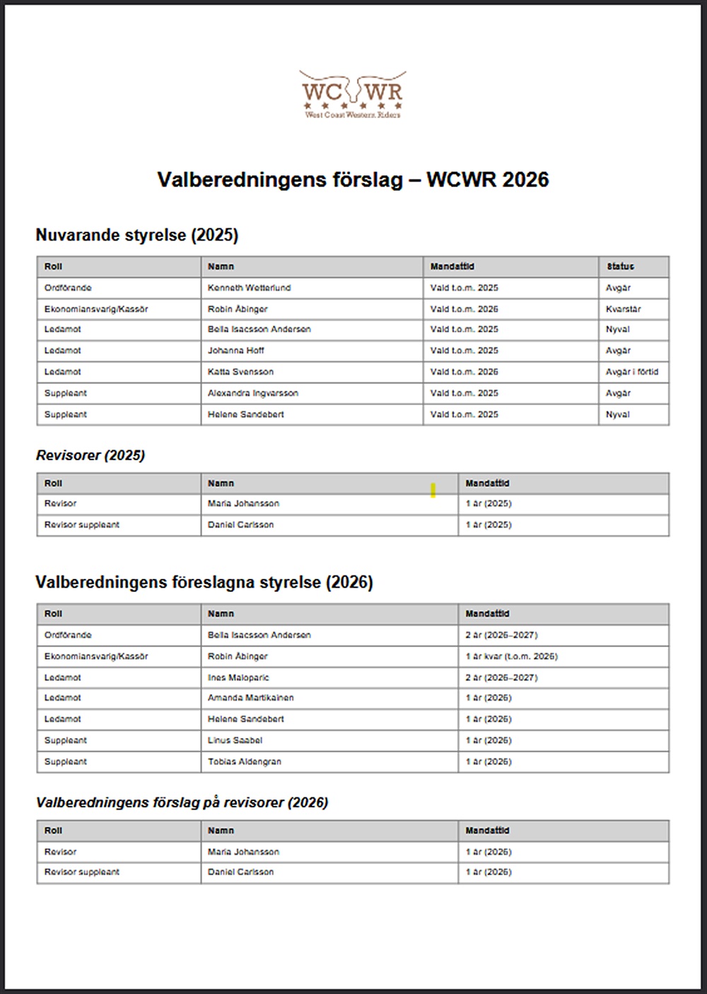 Valberedningen presenterar här sitt förslag utav styrelsen för WCWR 2026. Har du någon mer du vill nominera? Ring Ines Maloparic på mobil nr. 0738939940!