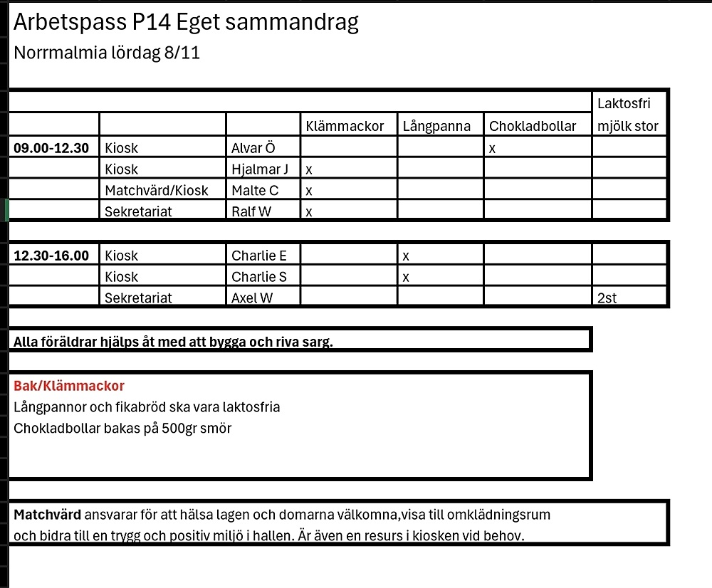 Här kommer fördelningen av arbetspass, bak etc för helgens sammandrag på Norrmalmia.