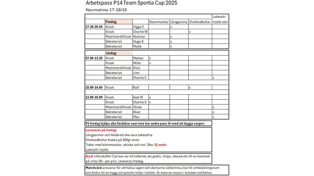 Här kommer fördelningen av arbetspass, bak etc. Läs hela dokumentet och bekräfta i kommentarsfältet att ni har läst det.