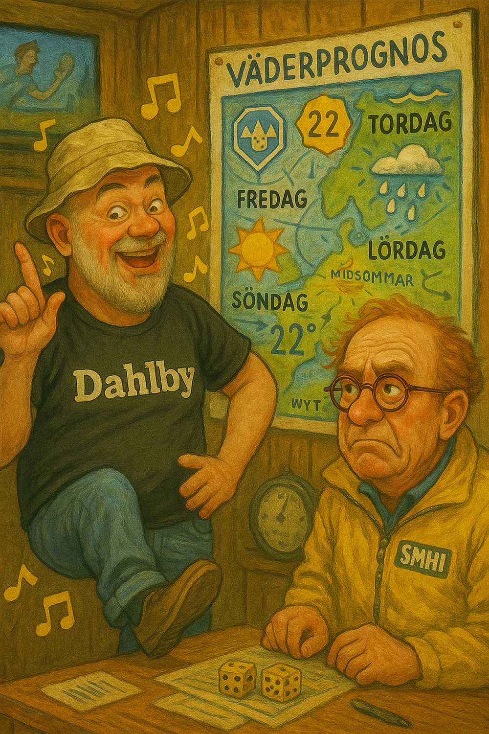Det var en strålande glad Dahlby som i förmiddags meddelade att det kommer bli 20 grader och utespel under Midsommarspelen på Saltviks Camping! I samma prognos hade även den väderglade Dahlby slängt in sin egen 10 dagarsprognos för kommande tävlingar i Sopot. 22 grader torsdag-fredag och perfekt väder meddelade Dahlby i samband att han dansade rakt in i uppladdningsfasen för kommande tävlingar.